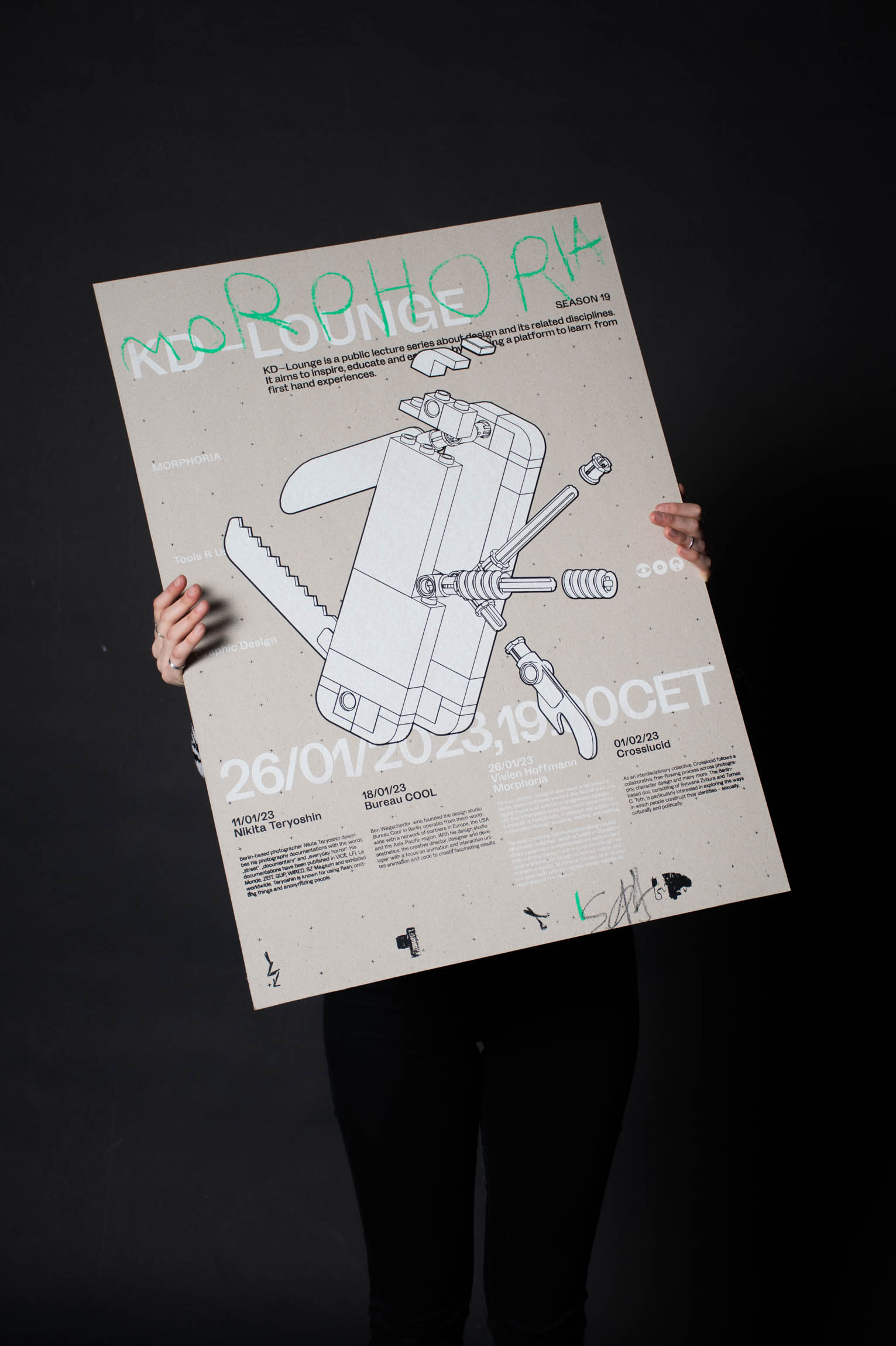 KD—Lounge is a public lecture series at HTWG in Konstanz, featuring renowned designers, studios, and agencies to inspire young designers. Organized by students on a non-profit basis, funding comes from merchandise sales and local sponsors. We created a concept, branding and promotional materials as well as 3D animations and animated posters for each lecture. Under the motto Tools 'R' Us, we focused on the tools that make the work of our speakers special and staged them as key visuals. We also managed logistics, invited speakers, and hosted the events. Our project received silver and bronze nails, as well as an award from the Art Directors Club Germany.
